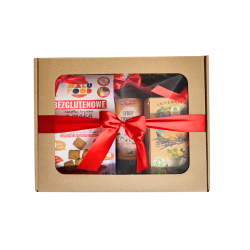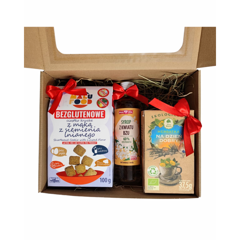 Ręcznie pakowany zestaw w ekologicznym pudełku z siankiem, ozdobiony czerwoną wstążką. Idealny jako prezent świąteczny, dla nauczyciela, współpracownika lub bliskiej osoby.