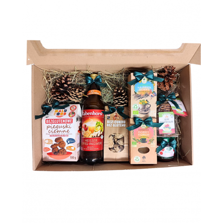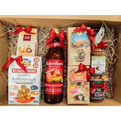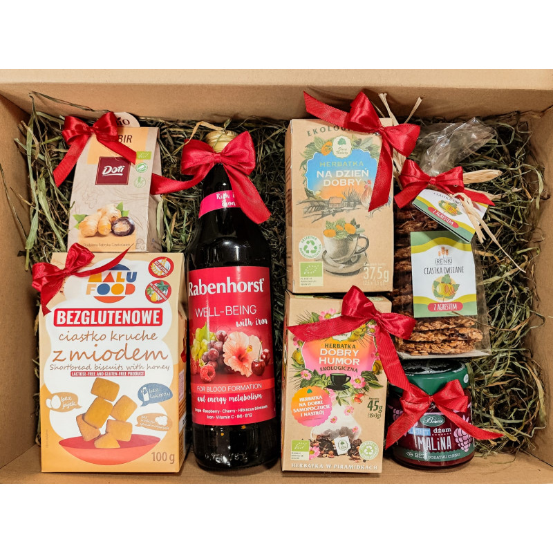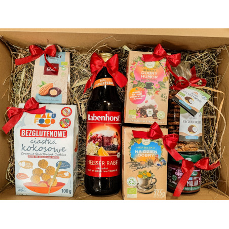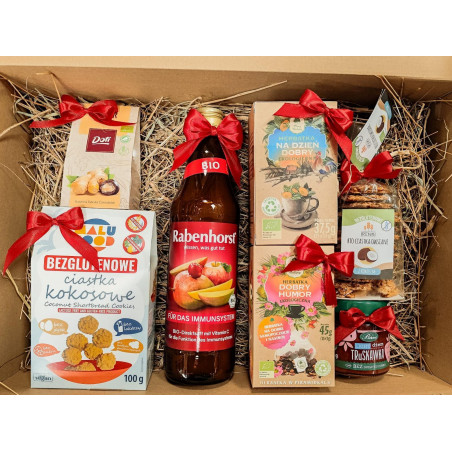 Naturalny, pięknie udekorowany zestaw pełen zdrowych, pysznych i ekologicznych produktów. W boxie znajdziesz wybrane składniki z poniższej listy: